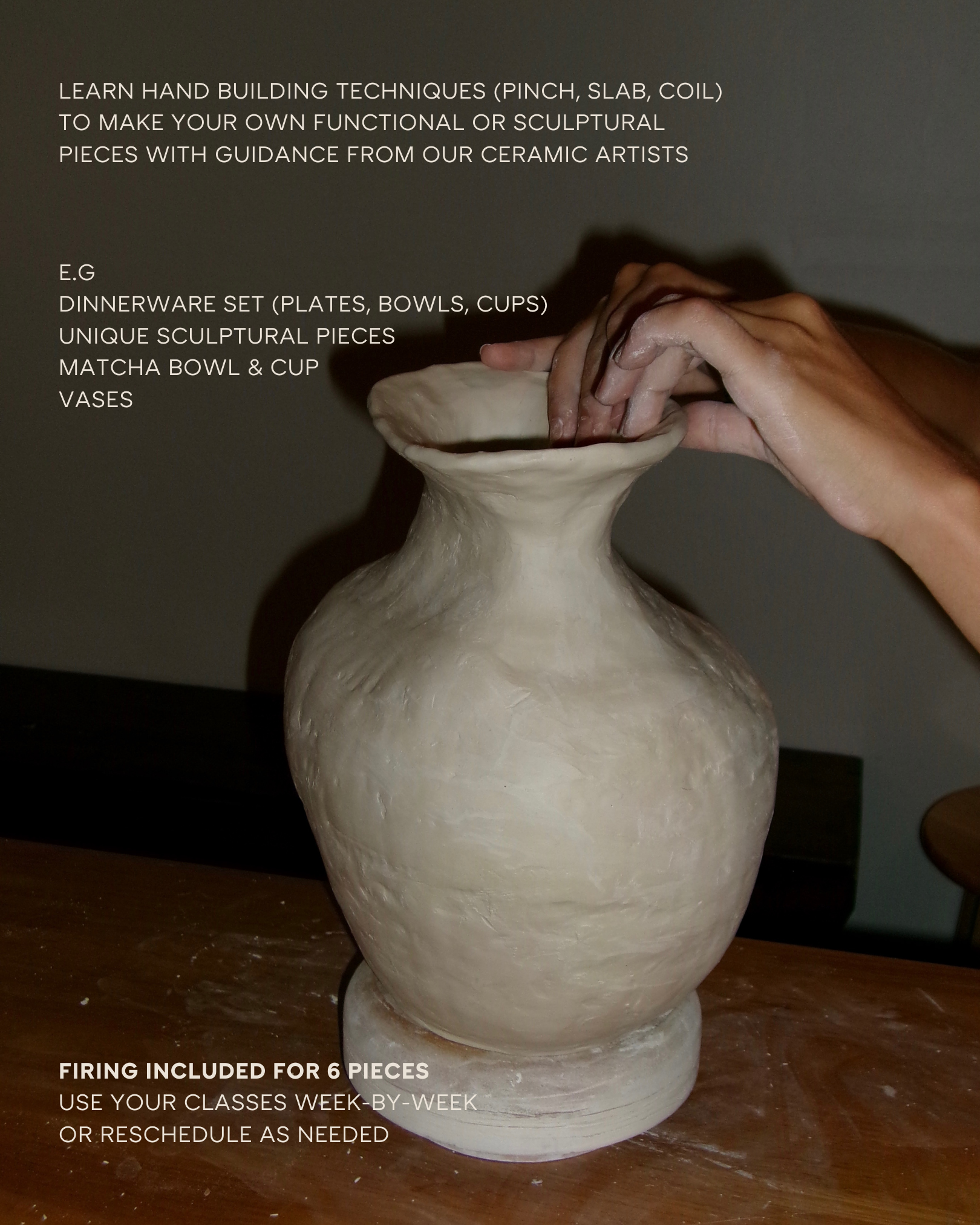 Includes: 6 x 2-hour guided sessions, all clay, tools, and the firing/glazing for up to 6 pieces.