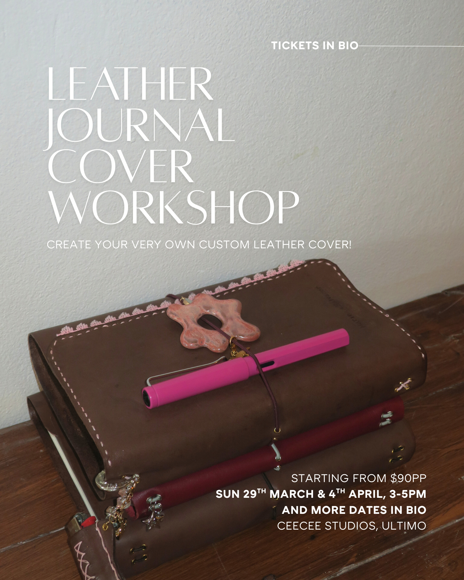 BYO charms from home, your journals and anything else you might like to add to your leather cover!